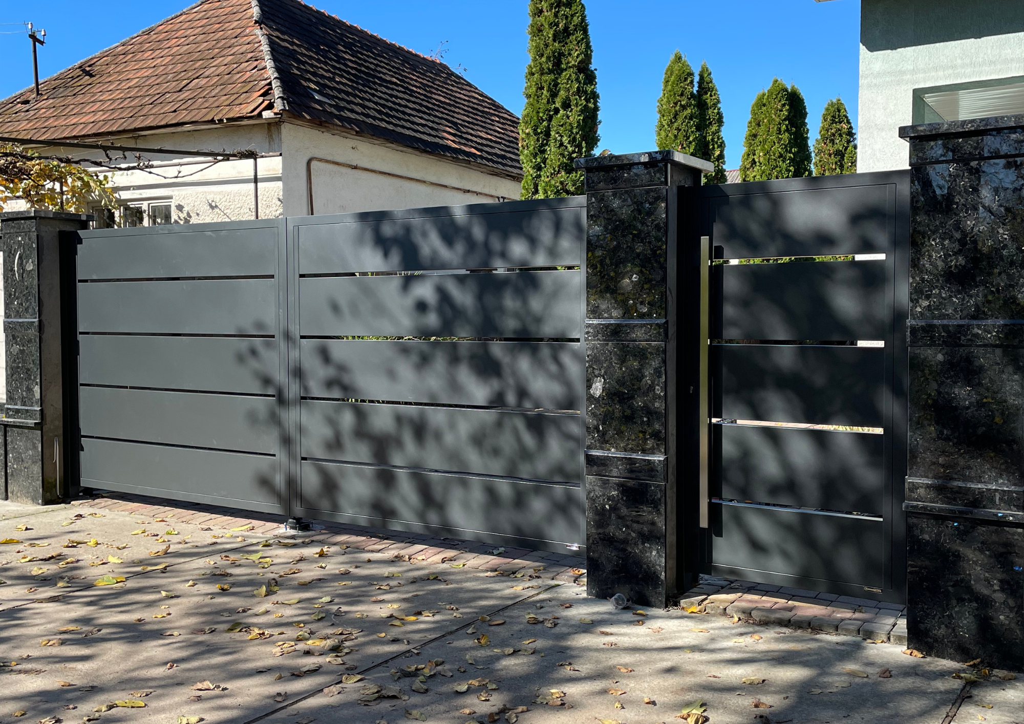 Одним из главных плюсов такого решения остается визуальная универсальность. Современный стиль не обязательно означает что-то сложное или перегруженное. Наоборот, чаще всего речь идет о чистых линиях, аккуратной форме и ощущении порядка. Именно поэтому распашной формат так хорошо работает в современных проектах: он позволяет сделать въездную часть аккуратной, понятной и уместной без лишней тяжести.
